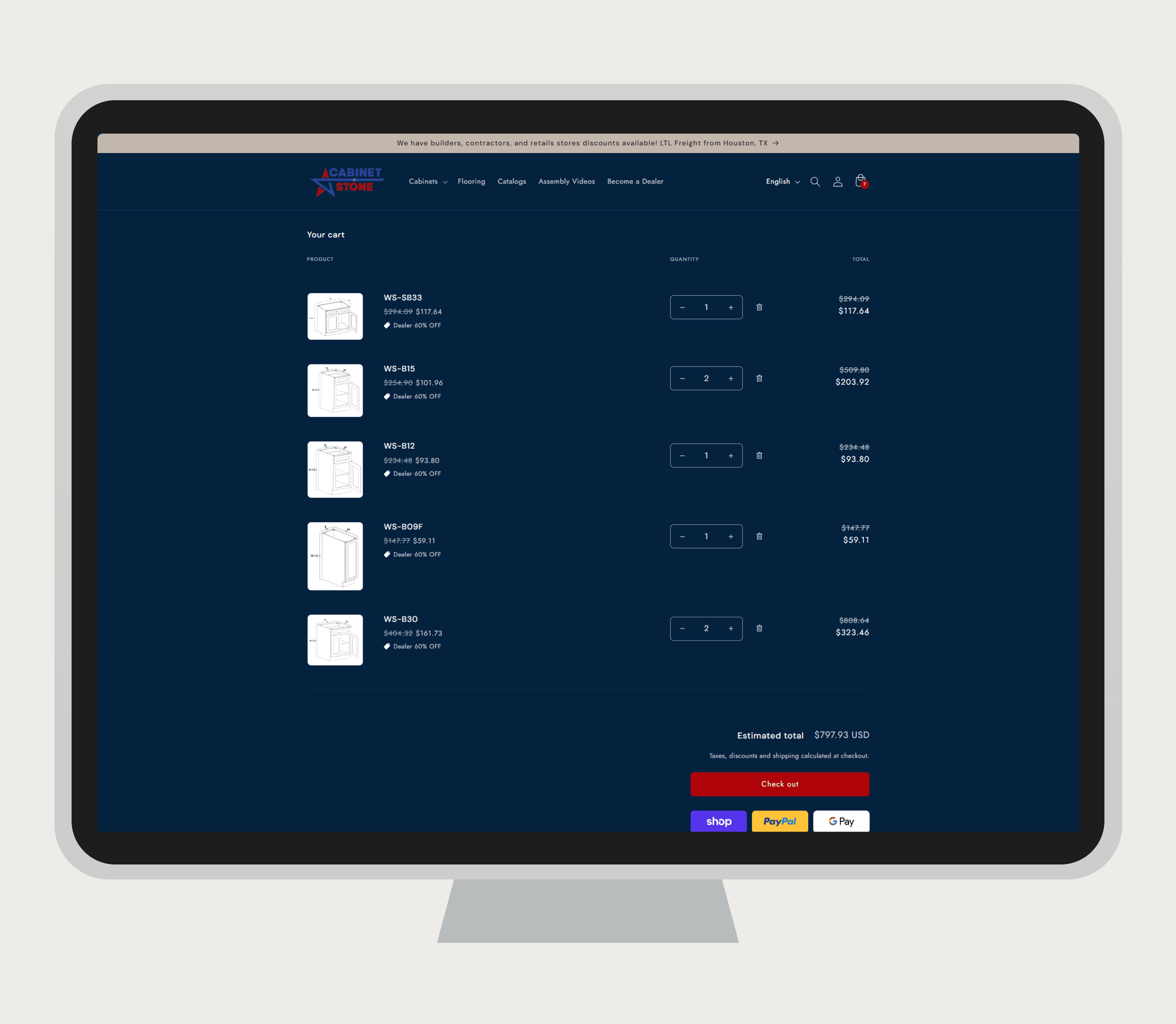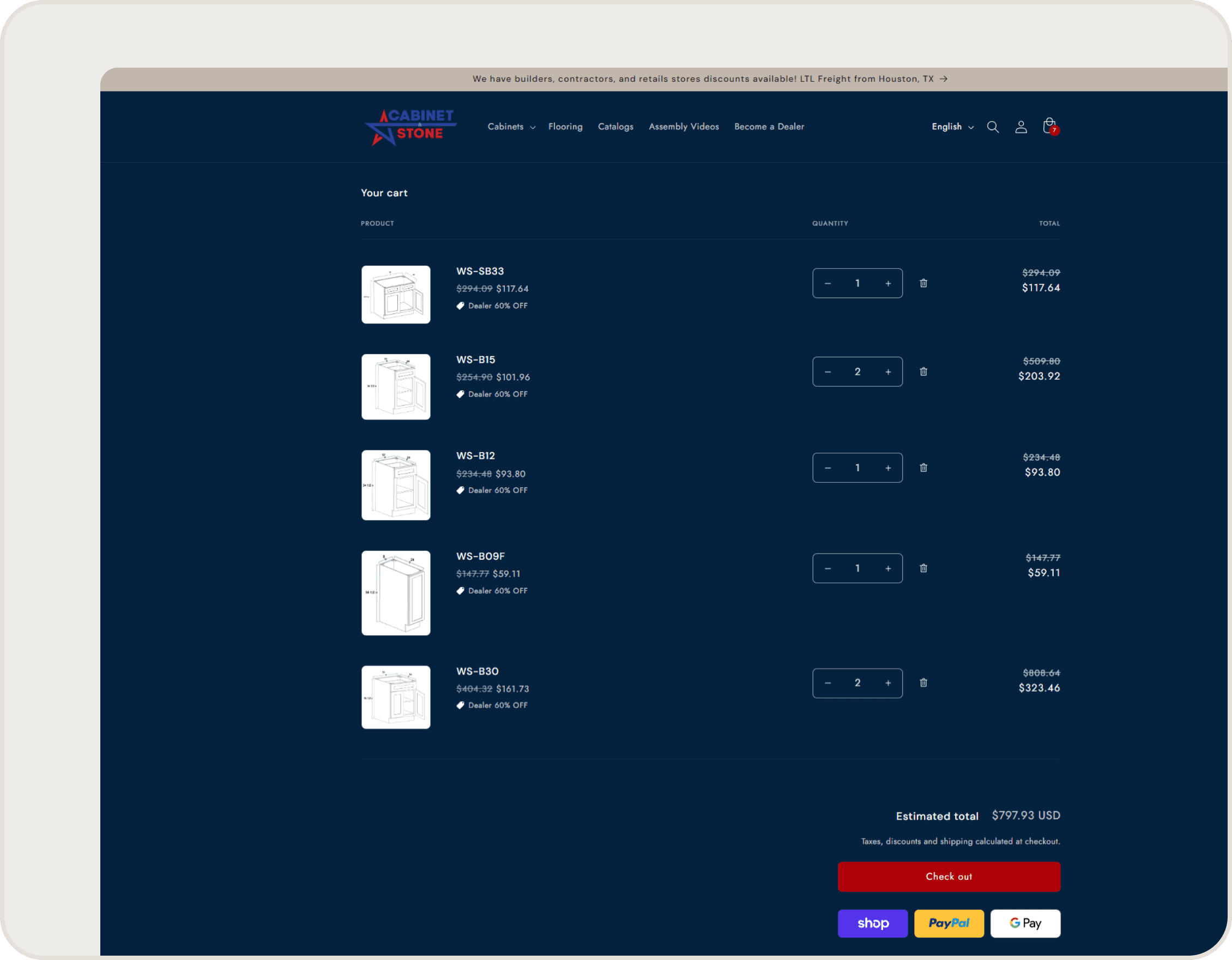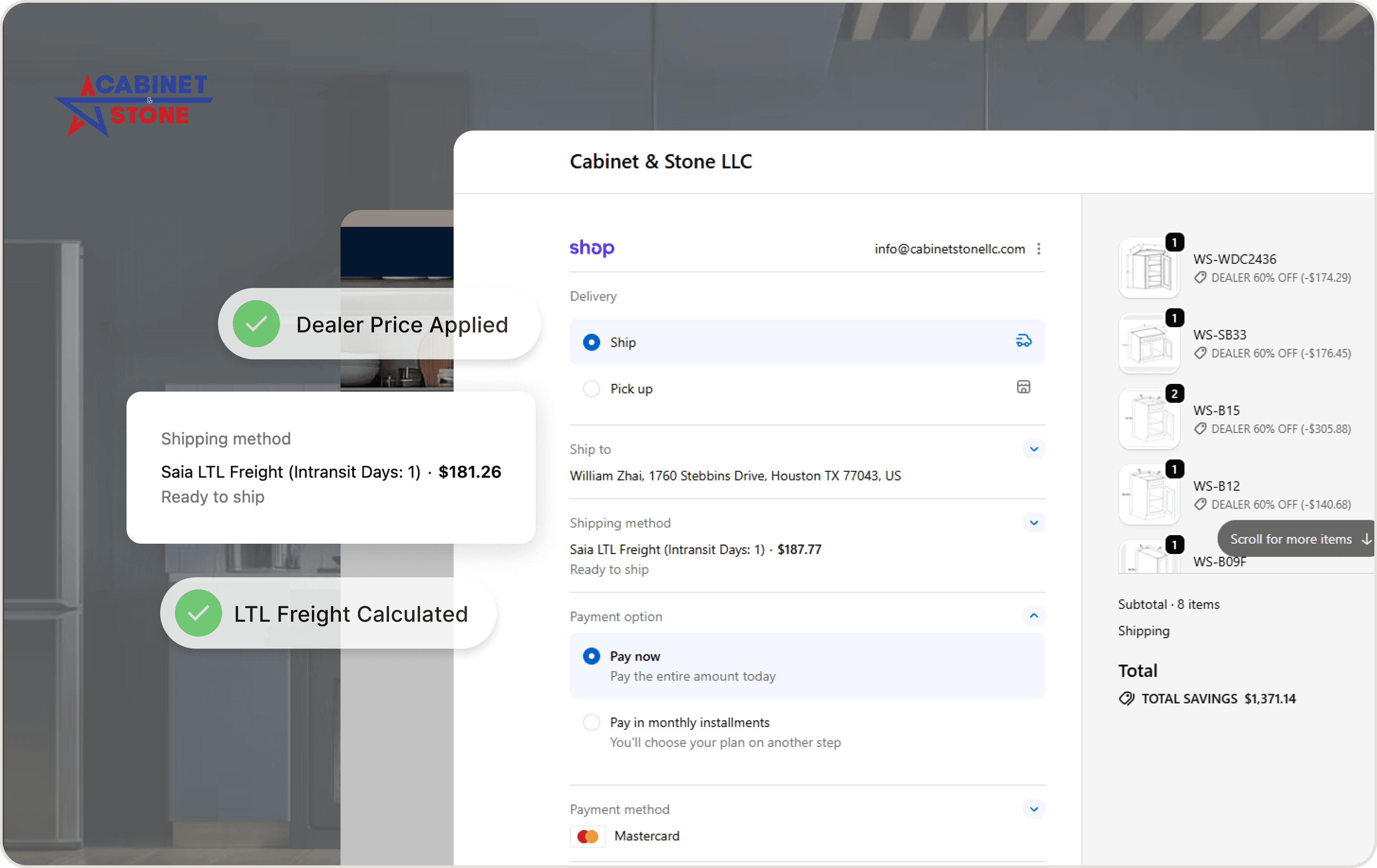 Cabinet & Stone previously relied on offline ordering and fragmented internal tools.As the business grew, the team needed a online ordering system that could support dealer-specific pricing, complex SKUs, and LTL freight.